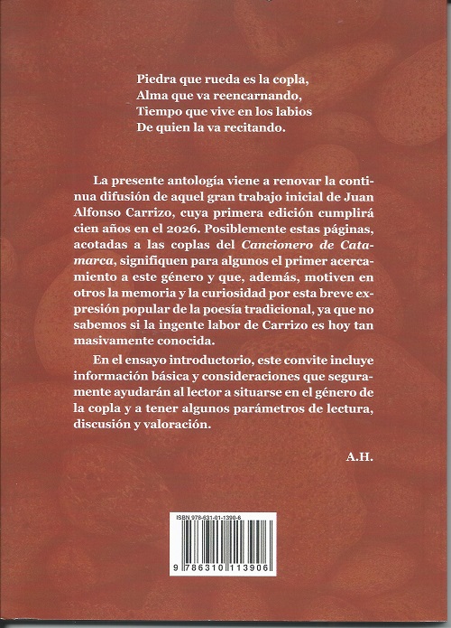 Este volumen, coordinado por el doctor Arturo Herrera Alfaro, ofrece una antología de las coplas de aquel trabajo inicial de Juan Alfonso Carrizo, cuya primera edición cumplirá cien años en el 2026. La antología contribuye a renovar la continua difusión de la ingente labor de Carrizo. Cuenta con un ensayo introductorio del Dr. Herrera Alfaro, que incluye información esencial y consideraciones necesarias con el fin de ayudar al lector a situarse en el género de la copla y a tener algunos parámetros de lectura, discusión y valoración. La selección fue realizada por las jóvenes profesoras Luján Ale Maciel, Florencia Lastra, Florencia Ailén Leiva. Algunos textos llevan notas al pie, facilitadoras de lectura para quien no esté habituado a giros locales o expresiones ya en desuso.